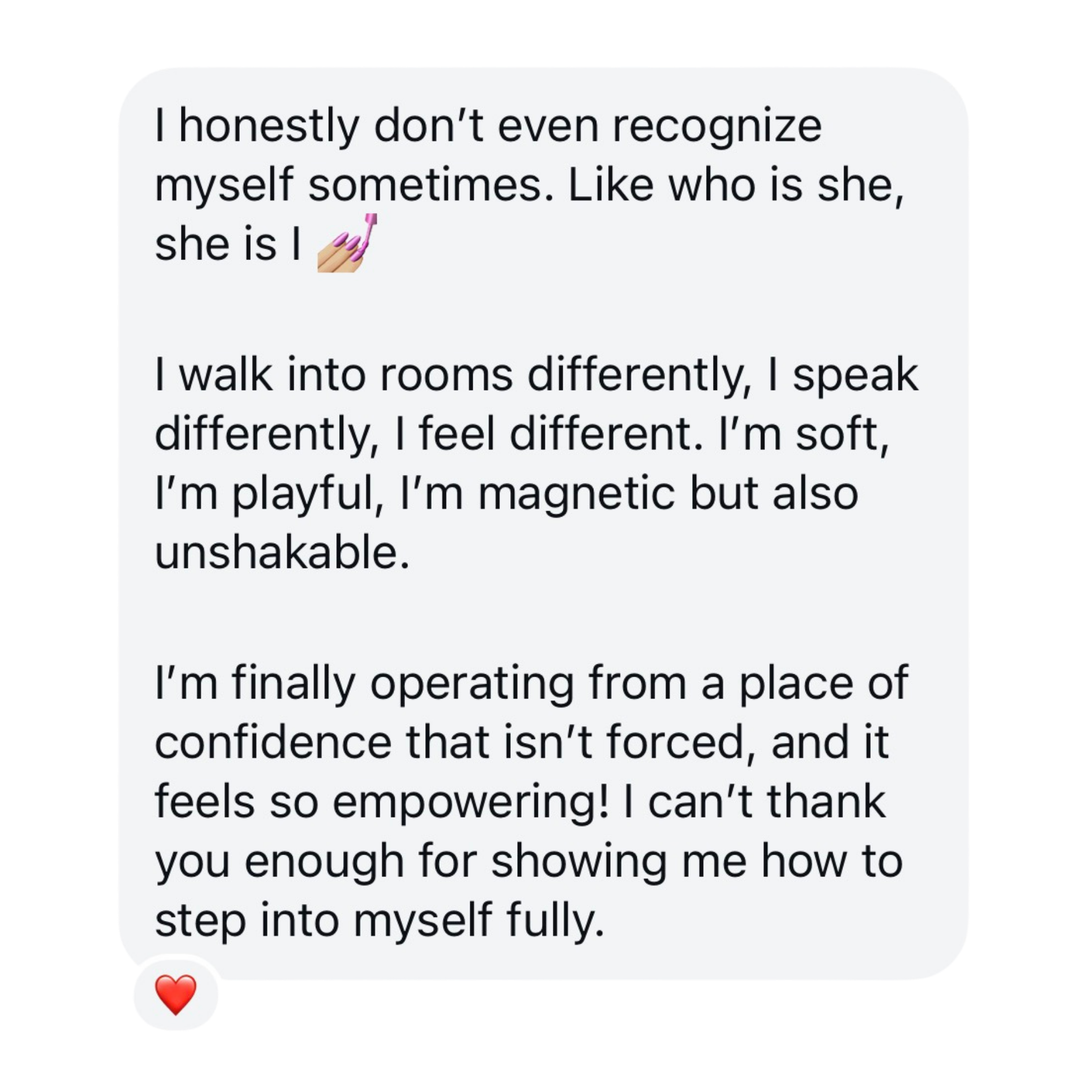 Every woman’s journey is unique, because we each start in different places with different desires. Some women step into magnetic confidence, aligned love, income growth, career breakthroughs, or body confidence, while others experience deep emotional freedom and clarity. The most consistent result? You become the woman who knows she gets to have what she wants; unapologetically, fully, and with ease. Everything else flows naturally from that internal shift. You’ll see “impossible” results start showing up in your life the kind that make your friends whisper, “How did she do that?”